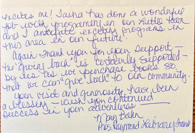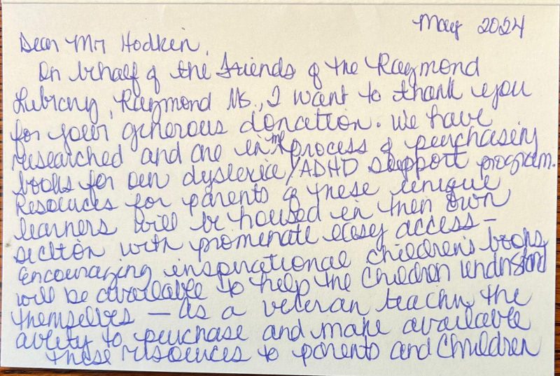 $1,000 has been given to the Raymond Public Library, Mississippi, to support literacy skills development among young library users who, for various reasons, need help to catch up.